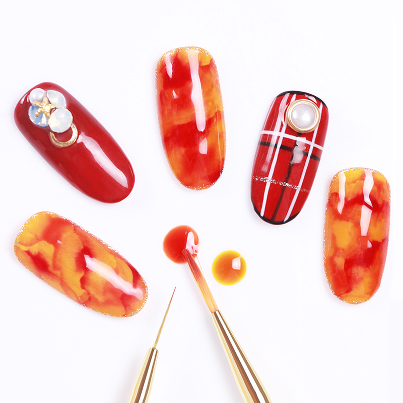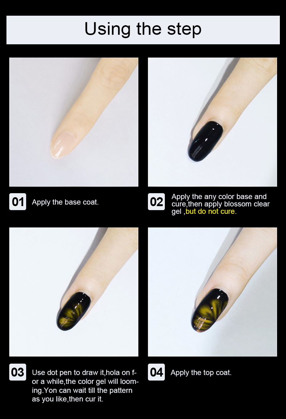Use dot pen to draw it, hold on for a while, the color gel will blooming. You can wait till the pattern as you like, then cure it.