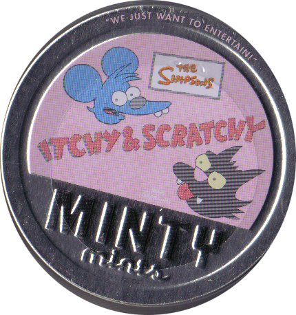 Studio : Kryptonite Kollectibles Publisher : Kryptonite Kollectibles Binding : Misc. Product Description The Simpsons Minty Mints comes in a collectible tin. Tin has fun Itchy and Scratchy artwork. Collectible tin measures 3 inches in diameter and 3/4 inch deep. 0
