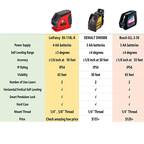 LotFancy Self-Leveling Cross Line Laser Level Kit with Case, Range 65 Ft., Accuracy 1/4 Inch at 100Ft., Ideal for Construction, DIY, Craftsmen and Professional Use
