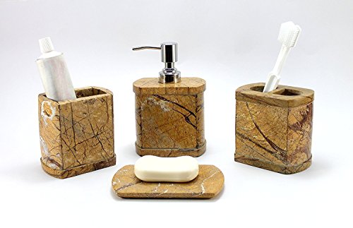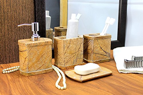 StonKraft 4 Pieces Bathroom Set Genuine Natural Multicolor Stone Bathroom Accessories - Toothbrush Docking Container, Soap Dispenser, Toothpaste or Cotton Docking Set and Soap Dish Plate