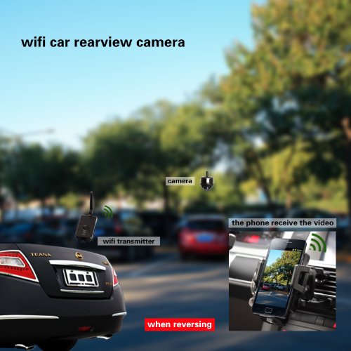 - Feature : This WiFi transmitter comes with a car rear view camera, also call as car WiFi camera, every time you put your car into reverse gear, the camera can send video signal to the screen of your iPhone, iPad, and Android phone, but need to down load APP to your phone and open the APP firstly. / Please note it is used for 12V car, not for 24V truck, bus as well as other heavy duty vehicles. / Notice:1.When the background is black or the image is still, please exit the app, and check whether the wifi connection is normal. Then click again the app icon to enter into the software interface. / 2.User could press the RESET button of the transmitter to renew the default factory SSID and password. / Other application: If you don't use the transmitter with the car rear view camera, you can use it together with FPV system or with CCTV camera system. If you want to buy a transmitter only,please choose Only transmitter.