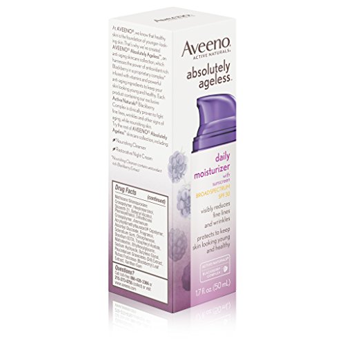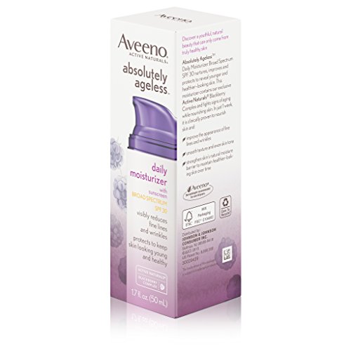 Create a healthy foundation for younger-looking skin by moisturizing daily with Aveeno Absolutely Ageless Daily Moisturizer with Broad Spectrum SPF 30 Sunscreen. This formula visibly reduces fine lines and wrinkles and helps protect to keep skin looking young and healthy. Absolutely Ageless Daily Moisturizer helps reduce the visible effects of elastin and collagen loss, but also nourishes skin, to keep it looking younger, longer. This anti-aging moisturizer contains Active Naturals Blackberry Complex infused with vitamins C and E, antioxidants, and powerful anti-aging ingredients. The dermatologist-tested and hypoallergenic formula is non-greasy and won't clog pores.Feature
