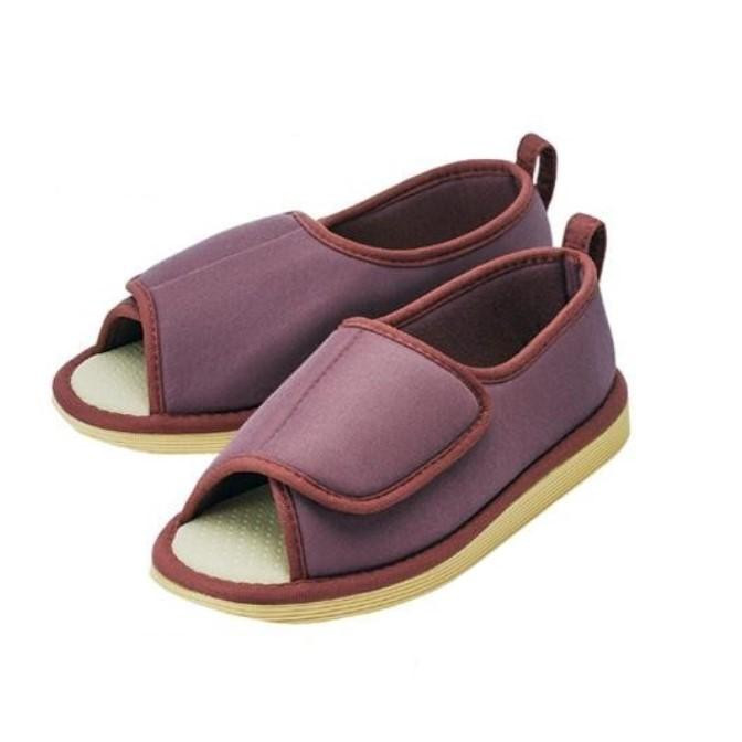 | かかとのあるシューズ型なので、スリッパのように脱げて転倒することを予防します。甲の部分は面ファスナーで調整できるので、足にフィットします。また着脱が容易です。底面は滑りにくい素材と3箇所に滑り止めを付けて、スリップを予防します。歩行中、床に引っかからないように、爪先の底を斜めにカットしています。 |