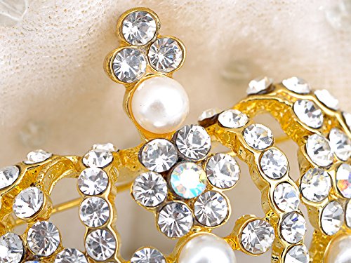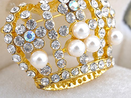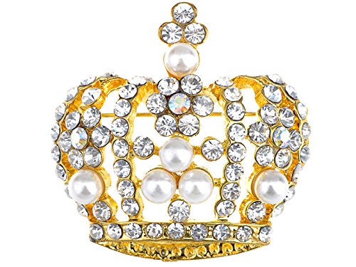 UNIQUE DESIGN: Brooch with clear crystal colored rhinestones, faux pearl, and crown design