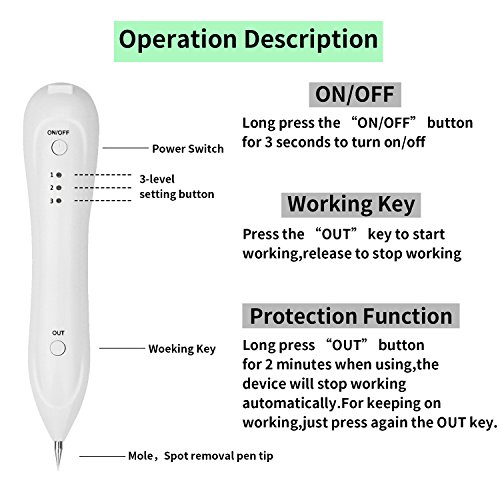 Precautions: 1.It is suggested to test with fresh pigskin when using this wart removal pen for the first time,then to do the treatment after you are fully familiar with this device's performance and operation. 2.Because this mole removal pen can produce high temperature effect in an instant,when not in use, please keep it well,avoid children and people who do not know how to operate this device using and playing with it, to avoid danger happening. 3.Please do not over clean the treatment area within 30 days after using this device(simple cleaning is ok),please do not scrub,please do not make the hard skin fall off artificially. 4.When the scab area is itchy(new skin growing period),please do not scratch it.The scab will fall off automatically after 20 to 30 days. 5.Recovery period is about 3 months,it is suggested that do not eat ginger(affect the smoothness of the skin),beef(can produce light red skin) and soy(can product light black skin) during recovery period. 6.When not in use for a long time,it is better to charge it every 3 to 4 months to keep the battery using life. 7.When the equipment has problem,please do not take it apart and try to repair it yourself to avoid danger. 8.It is forbidden to clean this equipment with water or other liquid directly to avoid damage and danger.