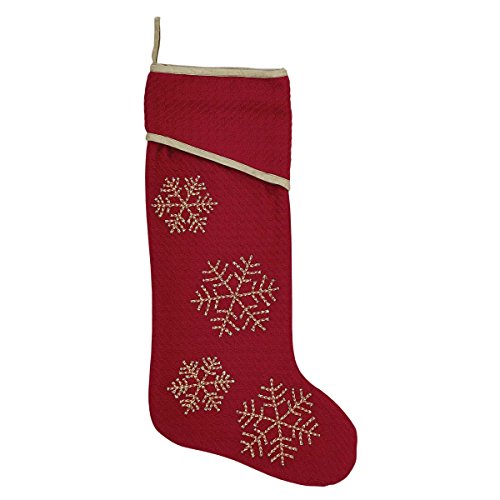 - Textured brick read woven fabric with shimmery embroidered snowflakes in read and golds braided rope