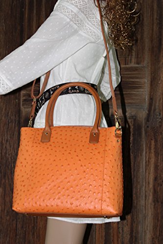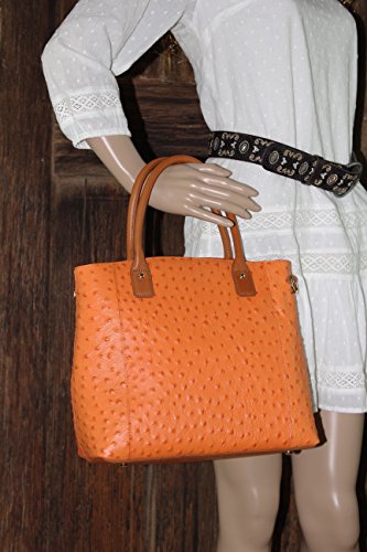 -. Brand : Gun Tote'n Mamas -. Color : orange -. Department : womens -. Feature : This American debossed Ostrich pattern cowhide concealment tote by Gun Tote'n Mamas has an wonderful ostrich texture that will age to a darker patina and becomes softer with use. It is stylishly trimmed and accented with full grain tan American cowhide. / The spacious zippered main interior is fully lined with Gun Tote'n Mamas logo lining and features 2 open side pockets and a zippered P.R.Ivacy pocket.The carrier has the option to use the short top carry tote handles or the adjusted shoulder strap for cross carry use. / The concealed carry compartment is designed for right or left handed use, measures approximately 7" L x 9" H and features an adjustable standard holster. / This gun compartment is constructed of ballistic nylon and can accommodate a large frame handgun. / Concealment Tote Dimensions: 12" L x 11" H 5" W (Double Handle 5" Drop, Adjustable shoulder strap 14" - 24") -. ProductGroup : Shoes -. ProductTypeName : HANDBAG -. Title : Concealed Carry Purse - Concealment Ostrich Town Tote - Left and Righthand Draw - CCW - by Gun Tote'n Mamas