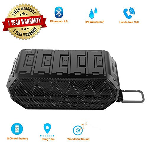 -. Feature : 2*3W SELFIE SPEAKER : Implemented With 2*3W loudspeaker in the little device which can produce a loud, clear and high qualify sounds. You also can use the speaker to take pictures and self timer while listening to music. / WATERPROOF,SHOCKPROOF,DUSTPROOF : Rated IPX6 for resistance against dust and water, meaning the Speaker can withstand pressurized jets and waves of water. TPU material avoid scratching and anti-shockproof(test passed within 1 meter),Can be used under harsh environment. / WIRELESS BLUETOOTH TECHNOLOGY : Advanced Bluetooth V4.2 technology,Ensure your smartphone or other Bluetooth device from up to 33-66 feet away without obstacles. Built-in microphone for hands-free speakerphone cellphone over Bluetooth from smartphone and your phone. / LONG BATTERY LIFE : For up to 24 hours of playtime at medium volume, up to 15 hours playing time at the maximum volume.3000H standby time perfect for an all day outing. And Have battery residual quantity indicator function. / WARRANTY : If you have any problem with this item, please contact us directly, and we'll provide help for you. Very suitable for outdoor party, camping, poolside, shower, beach etc.