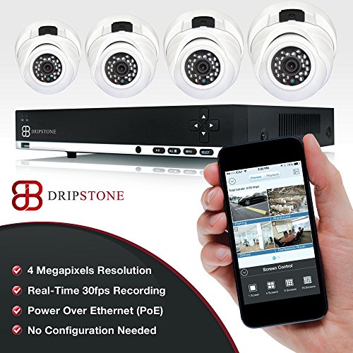 Dripstone 4 Megapixel (4MP) 4 Channel PoE NVR Network Video Recorder with 4 x 4MP Indoor/Outdoor Night Vision Onvif Security Dome IP cameras with Audio, Easy Setup Smartphone and Tablet Remote View