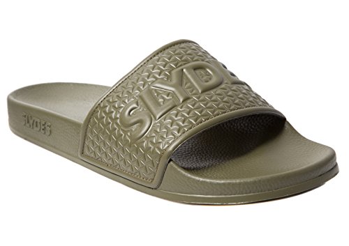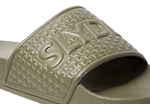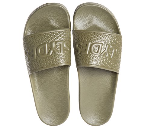Binding : Apparel Product Description These men's khaki slip on slider sandals feature a signature deboss logo upper, with matte and gloss contrast textures. All Slydes have our renowned quick-drying single-bandage upper, form fitting contoured footbed and textured sole for grip and durability. 0