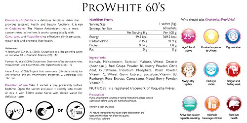 Kinohimitsu ProWhite is a delicious, functional drink that will provide you with systemic health and beauty functions all at the same time. Containing Glutathione and two 'superfruits' - Camu-camu and Maqui Berry, Kinohimitsu ProWhite works to eliminate spots and reduce oxidative stress! This powerful package of nutrients work in synergy to enhance skin clarity and radiance, boost your immune system and promote the health of your liver for stunningly flawless, glowing skin in just a matter of weeks!Feature