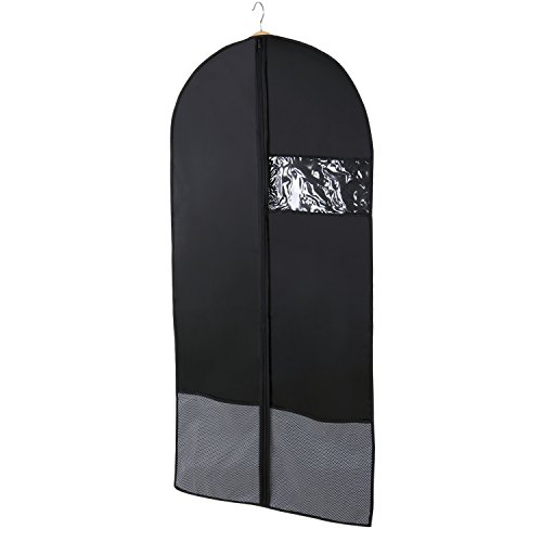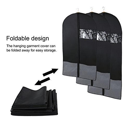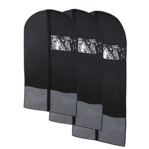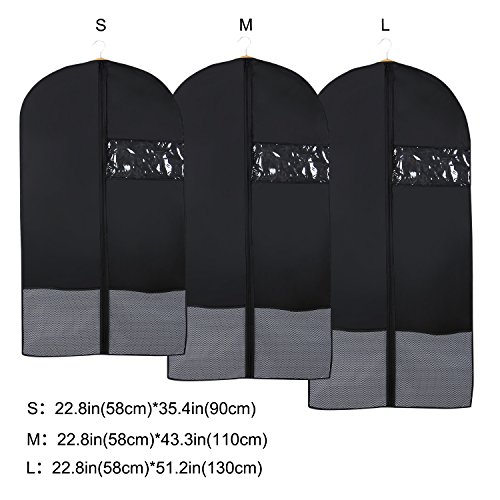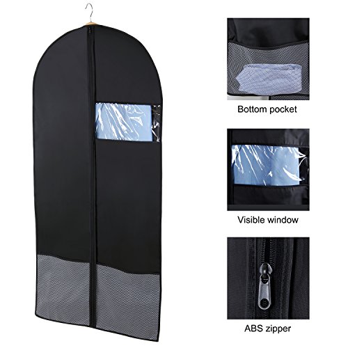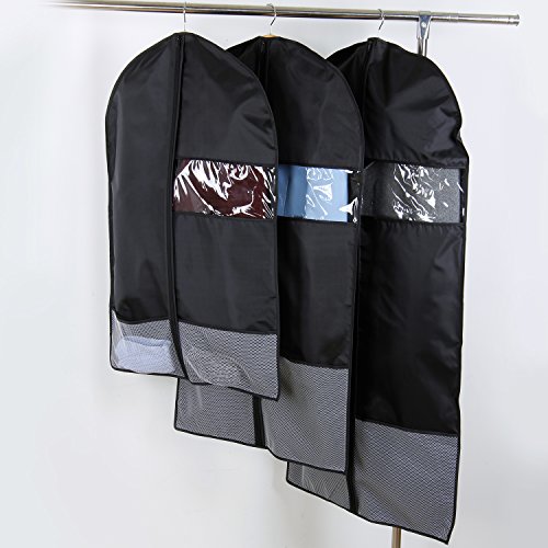 -. Feature : PREMIUM MATERIALS: Made of 200D oxford cloth to protect garment from dirt, dust, moths and ensure odor resistance. / VISIBLE WINDOW: Easily identify the clothes inside without opening the garment bag by a clear plastic window in each suit cover. / PRACTICALITY: Good for travel or home use to the long term storage of suit, dress, leathers, jackets, trousers etc. / BOTTOM NET POCKET: Features two bottom net pockets to store small pieces of clothing and accessories. / CONVENIENCE: Equipped with a ABC anti-twisted plastic zipper to allows to work up and down smoothly.