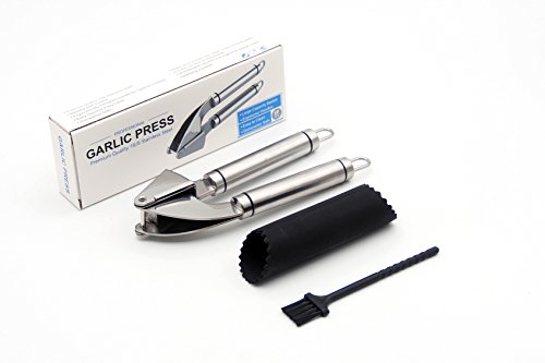 Freegoing Garlic Press Stainless Steel Mincer with Silicone Tube Roller Peeler Cleaning Brush Set