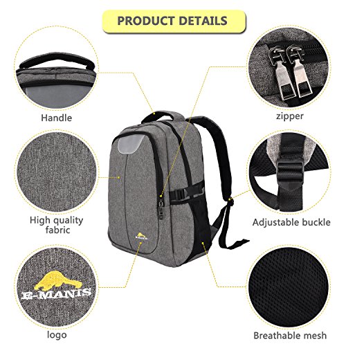 -. Binding : Personal Computers -. Brand : E-MANIS -. Label : E-MANIS -. Manufacturer : E-MANIS -. MPN : E-22 -. PartNumber : E-22 -. ProductGroup : PC Accessory -. ProductTypeName : CARRYING_CASE_OR_BAG -. Publisher : E-MANIS -. Studio : E-MANIS -. Title : Laptop Backpack School Bookbag with USB Charging Port under 15/15.6 Inch Laptop for College Travel Men Wowen (gray)