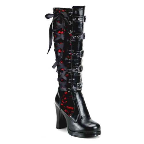 Binding : Apparel Product Description Shaft Height: Approx. 14' Tall. Heel Height: Approx. 4' Tall. This knee high boot is the perfect mix of dark and romantic. The two tone lace and ribbon detailing on the side give this shoe a feminine element while the edgy buckles give this boot some gothic inspiration. 0
