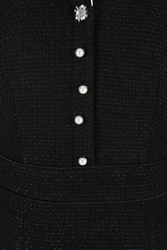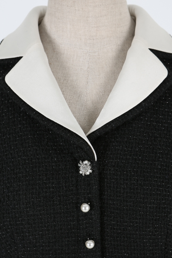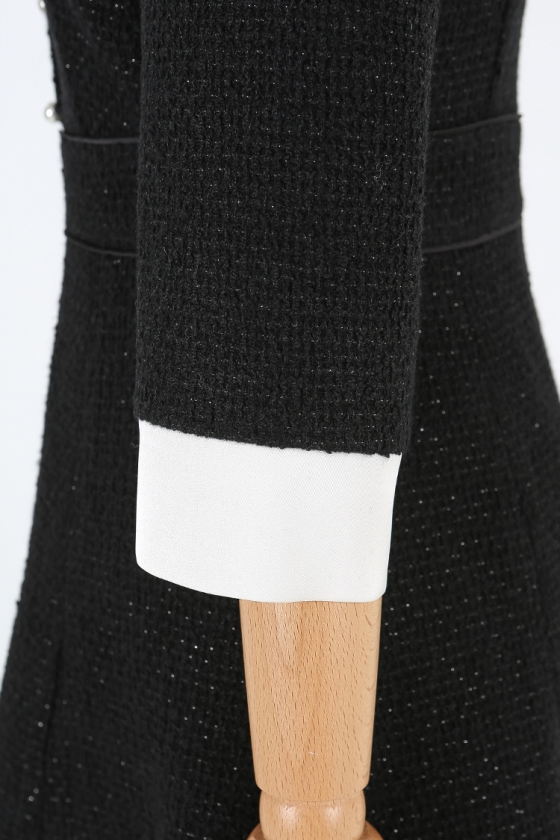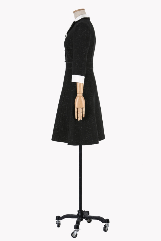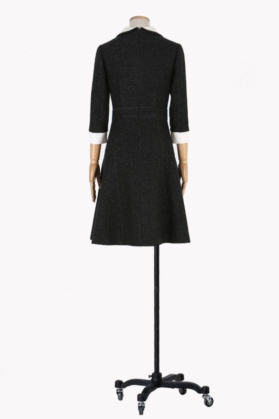 칼라와 소매 배색이 블라우스를 레이어드해서 입은듯한 느낌을 주는 트위드 원피스입니다.앞중심에는 장식 단추로 포인트를 주었으며, 뒷중심 콘솔지퍼 여밈이 있습니다.레트로한 칼라와 실루엣이 페미닌한 무드를 연출해 주는 아이템입니다.