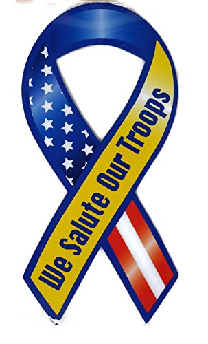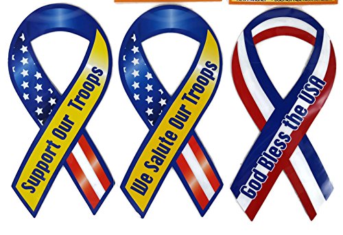 This Set Features One of each of the 3 different ribbon styles - We Salute Our Troops, Support Our Troops, and Good Bless the USA. Ribbons are Stars, Stripes and Yellow.