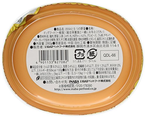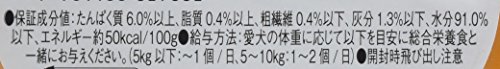 原材料:鶏肉、野菜(人参、ジャガイモ、カボチャ、インゲン、グリンピース)、デン粉、チキンパウダー、タンパク加水分解物、寒天、増粘多糖類、ビタミンE、緑茶エキス、紅麹色素