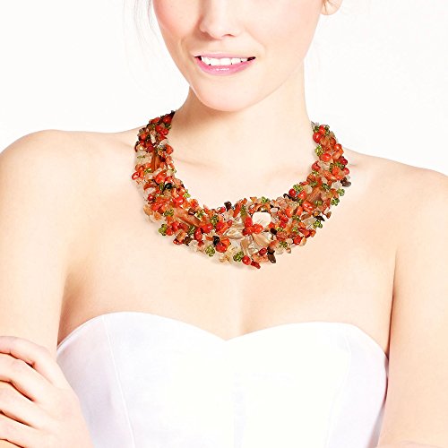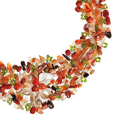 Local artisan Sheila from the Philippine Islands showcases amazing craftsmanship with this handmade necklace. The necklace features native mother of pearl (dyed), reconstructed red coral, carnelian, tiger's eye and beading in a truly exotic tropical motif. Chic yet casual, this breathtaking necklace is great for making a fashion statement. PLEASE NOTE: The handcrafted nature of this product will produce minor differences in design, sizing and weight. Variations will occur from piece to piece, measurements may vary slightly.Includes an original AERAVIDA organza jewelry pouch (comes in various colors), also handmade by our Artisans. Perfect for gift giving to someone special or keep for yourself!