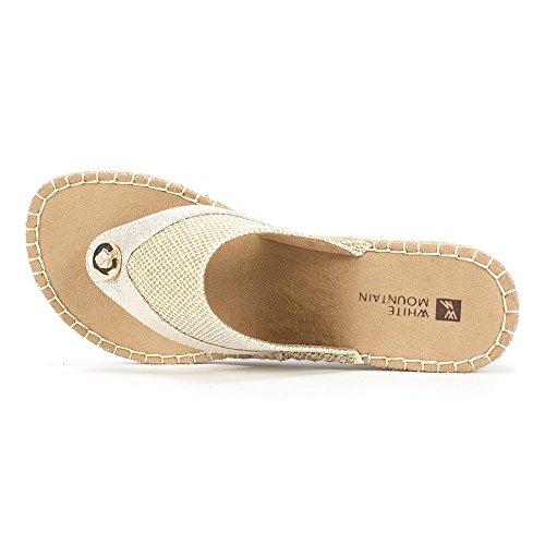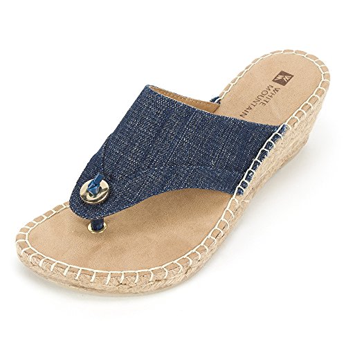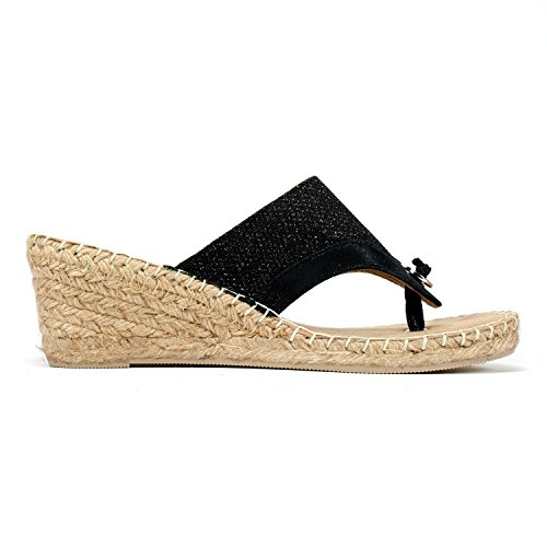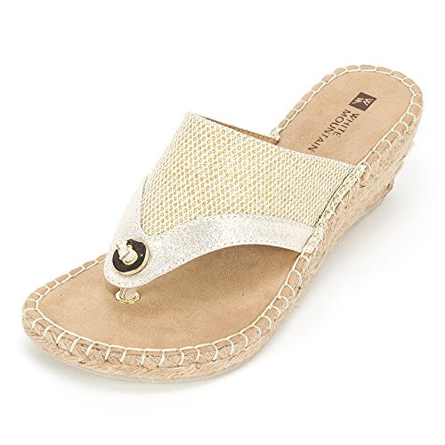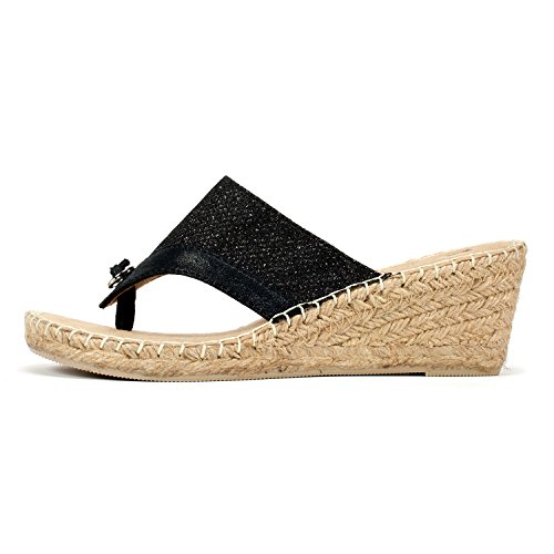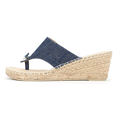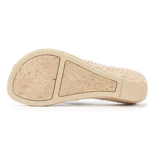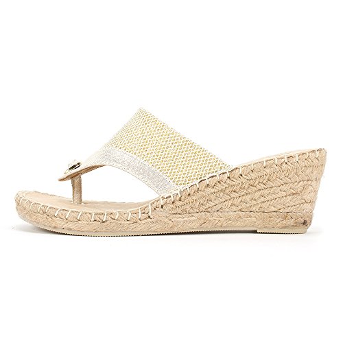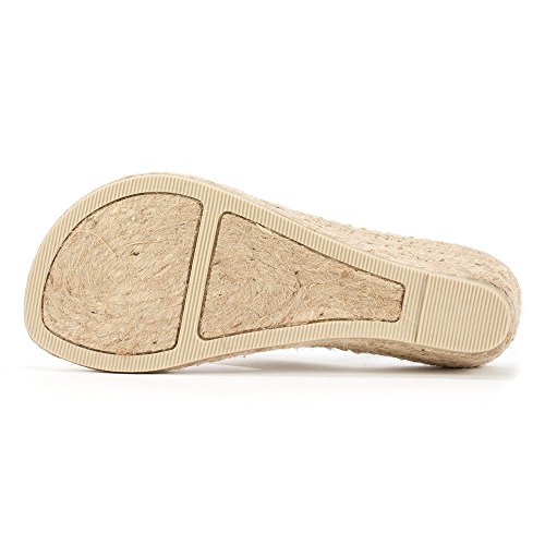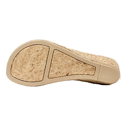 Product DescriptionThong style wedge with woven rope platform and sole. Our classic summer silloutte with piping. A little touch of detail goes a long way. Heel height: 1"0