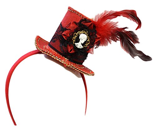 -. Brand : NHC -. ClothingSize : One Size -. Color : red -. Department : unisex-adult -. Feature : Mini Red Top Hat Headband w/ Feathers and Skeleton Cameo (Poly) / VIBRANT COLOR ELEGANT LOOK / MINI RED TOP HAT HEADBAND FEATHERS SKELETON CAMEO / MINI HAT COSTUME ACCESSORY / One Size -. Label : Jacobson Hat Company -. Manufacturer : Jacobson Hat Company -. Model : 26493 -. MPN : 26493 -. NumberOfItems : 1 -. PackageQuantity : 1 -. PartNumber : 26493 -. ProductGroup : Apparel -. ProductTypeName : ADULT_COSTUME -. Publisher : Jacobson Hat Company -. Size : one size -. Studio : Jacobson Hat Company -. Title : Mini Red Cameo Skeleton Steampunk Victorian Top Hat Headband Costume Accessory -. UPC : 763285223310