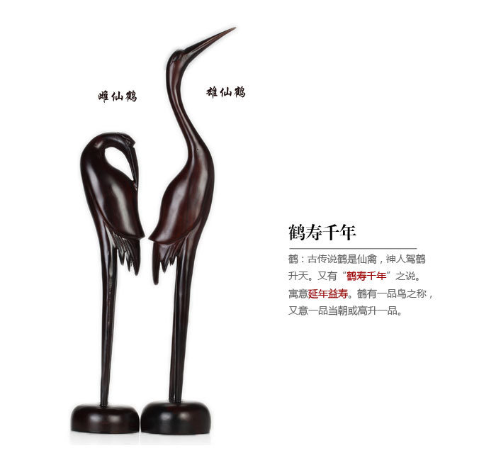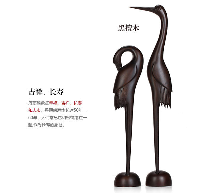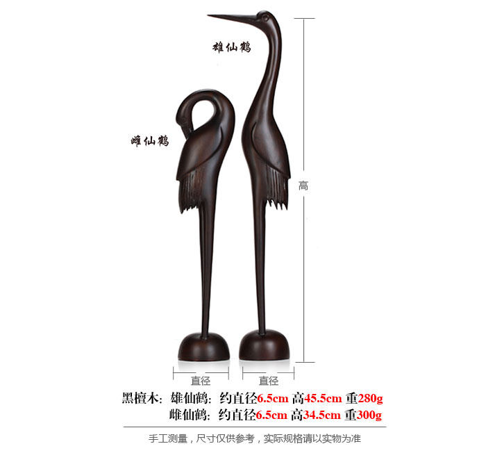 Product features: The crane, the symbol of longevity, Yun Long, the crane is a kind of birdspecies in the most noble, represent longevity, prosperity, moral health and longevity. The legend of the crane is a kind of immortal bird,according to "a leopard now note" contained, "crane millennium is pale,and two thousand are black, the so-called Xuan he also". That the ancients think how long the crane. Thus he is often considered to represent the bird longevity. Product introduction: Name: Crane Material: Sandalwood Size: Kurodan Ki: male crane: approximately 6.5cm diameter high 45.5cm The female crane: approximately 6.5cm diameter high 34.5cm Weight: Kurodan Ki: male crane: about 280g The female crane: About 300g Packaging: general packaging |