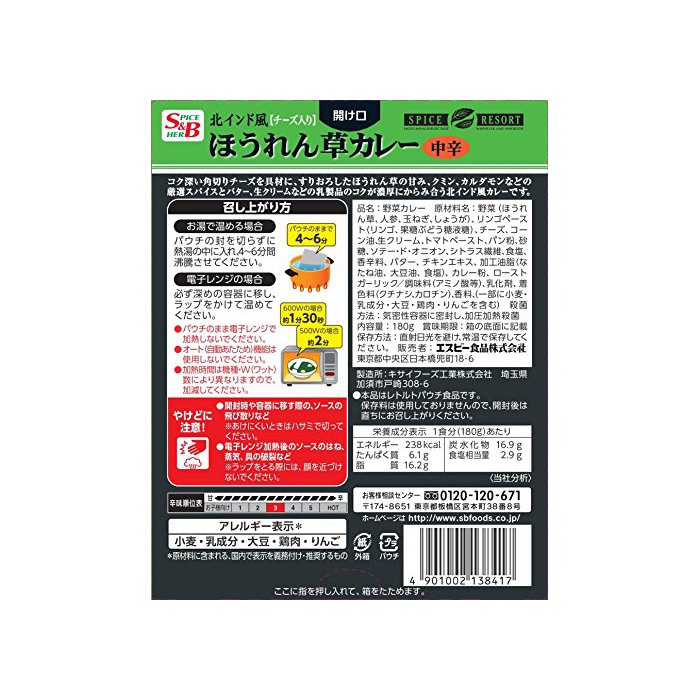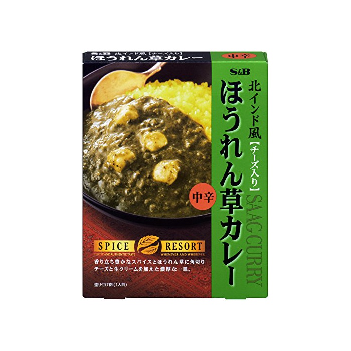 원본상품명: S&B スパイスリゾ?ト 北インド風ほうれん草カレ? チ?ズ入り 中辛 180g×5個