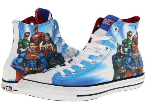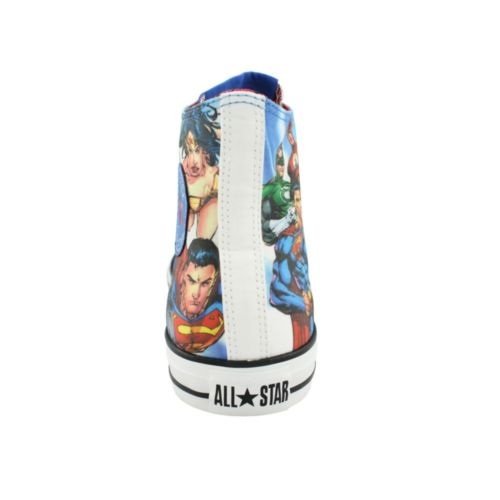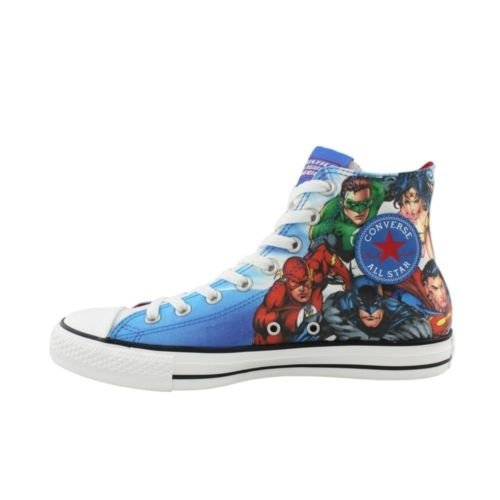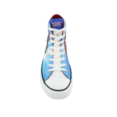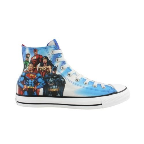 Featuring illustrations created by Andy Kubert, the Converse Chuck Taylor All Star Justice League sneaker illustrates the team of DC Comics Super Heroes on both sides of the sneaker. Compelling imagery is printed on the sneaker with the Justice League logo screened on the tongue and comes with both white and blue laces.Feature