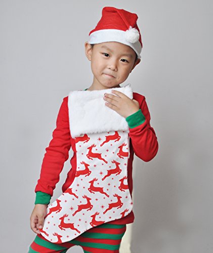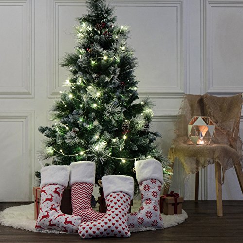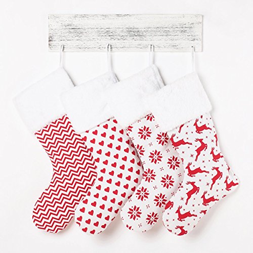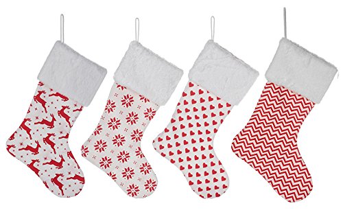 4 Burlap Christmas Stockings Decoration - 4 Pcs Set Print & Fur Collar Fireplace Decor Large
