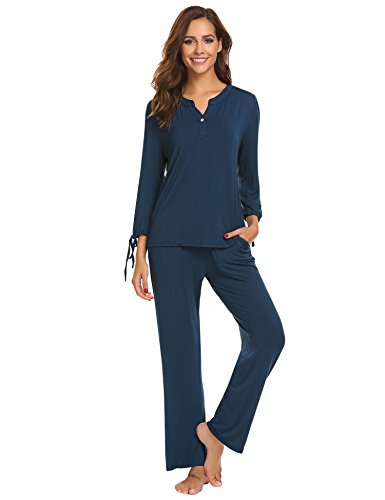 -. Feature : Material: This V-neck Pajama Sets made of 95% Rayon and 5% Spandex. Soft to touch and comfortable to wear / Occasion: Perfect for staying at home on the weekend, home relaxation and sleep / Design: This Pajama Sets is great as a loungewear and sleepwear, long sleeve and a button decorated on the V-Neck collar, elastic waist, and cuff tie / As a gift: It makes the perfect present for your mom, wife, daughter, or friend. everyone uses them on a daily basis. Give this pajama set as a thoughtful gift for your loved one's next birthday or for Christmas / Garment Care: Washing max 40 degrees Celsius, Iron with press cloth; please take the size information from the below 'Production Description' for your better accurate choice