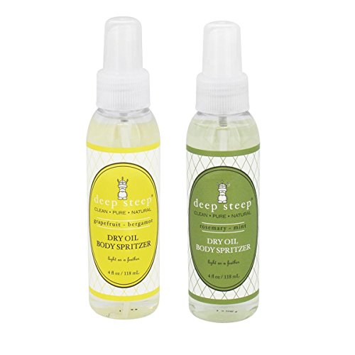 -. Feature : This bundle includes one unit of 4 fl oz (118 ml) Deep Steep Grapefruit Bergamot Dry Oil Body SP.R.Itzer and one unit of 4 fl oz (118 ml) Deep Steep Rosemary Mint Dry Oil Body SP.R.Itzer. / Deep Steep's Dry Oil Body SP.R.Itzer infuses thirsty skin with light and sensual aromatic oils leaving it silky smooth. / Clean. Pure. Natural. Light as a Feather. / Cruelty Free. No test on animals. / Daily Beauty Ritual: Lightly mist over body after a bath or shower for optimum moisturization.