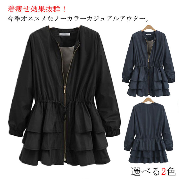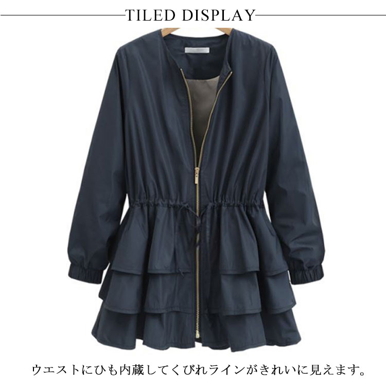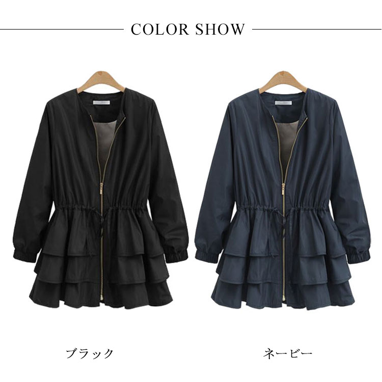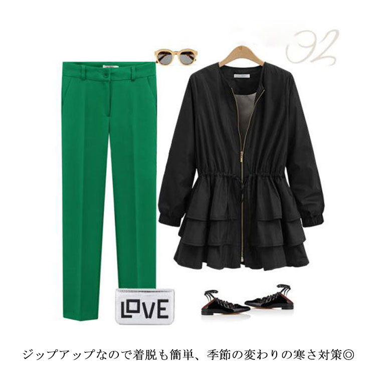 | 着痩せ効果抜群!今季オススメなノーカラーカジュアルアウター。ウエストにひも内蔵してくびれラインがきれいに見えます。裾部分は3段フリル切り替えたaラインも女性らしいフェミニン感を演出します。滑らかな裏地部分でチクチクせず、快適な着心地です。ジップアップなので着脱も簡単、季節の変わりの寒さ対策◎ | |