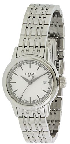 Stainless steel case with a stainless steel bracelet. Fixed stainless steel bezel. White dial with black hands and index hour markers. Minute markers around the outer rim. Dial Type: Analog. Date display at the 3 o'clock position. Quartz movement. Scratch resistant sapphire crystal. Solid case back. Case diameter: 29 mm. Case thickness: 8.2 mm. Round case shape. Band width: 14 mm. Deployment clasp. Water resistant at 30 meters / 100 feet. Functions: date, hour, minute, second. Casual watch style. Tissot Carson White Dials Stainless Steel Ladies Watch T0852101101100.Feature