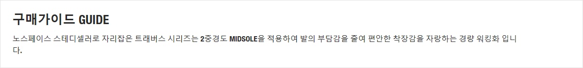 노스페이스 스테디셀러로 자리잡은 트래버스 시리즈는 2중경도 MIDSOLE을 적용하여 발의 부담감을 줄여 편안한 착장감을 자랑하는 경량 워킹화 입니다.