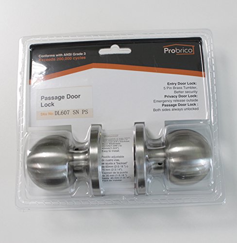 -. Color : Brushed Nickel -. EAN : 0709889693593 -. Feature : Brushed Nickel Finish.Confirm with ANSI Grade 3 / Adjustable Backset - 2-3/8 inch or 2-3/4 inch (60mm or 70mm) / Fits doors thicknes:1-3/8 inch to 1-3/4 inch (35mm to 45mm) / Universal handing; fits both right handed and left handed doors / Includes durable all metal construction -. Label : Probrico -. Manufacturer : Probrico -. MPN : DL607SSPS-6Pack -. PartNumber : DL607SSPS-6Pack -. ProductGroup : Home Improvement -. ProductTypeName : HARDWARE -. Publisher : Probrico -. Studio : Probrico -. Title : Probrico Passage Door Knobs Handles Brushed Nickel Ball Knobs For Hall / Closets Pack of 6 -. UPC : 709889693593