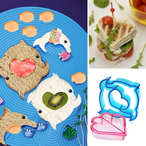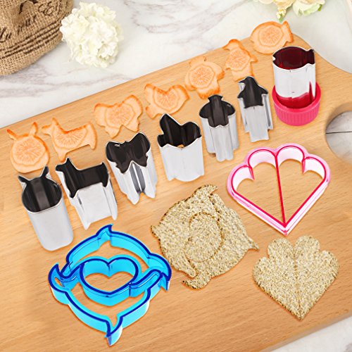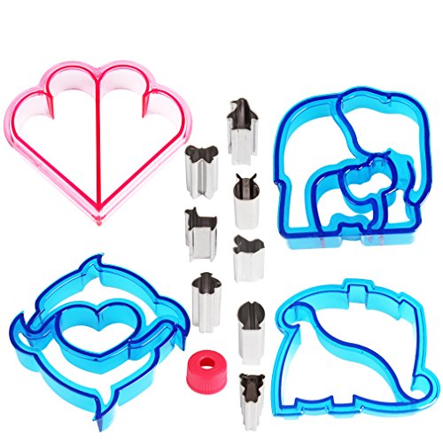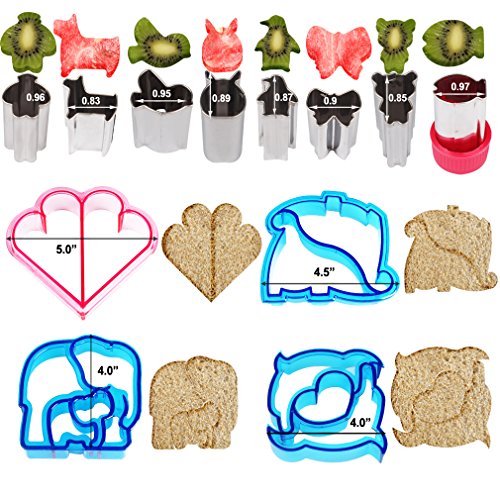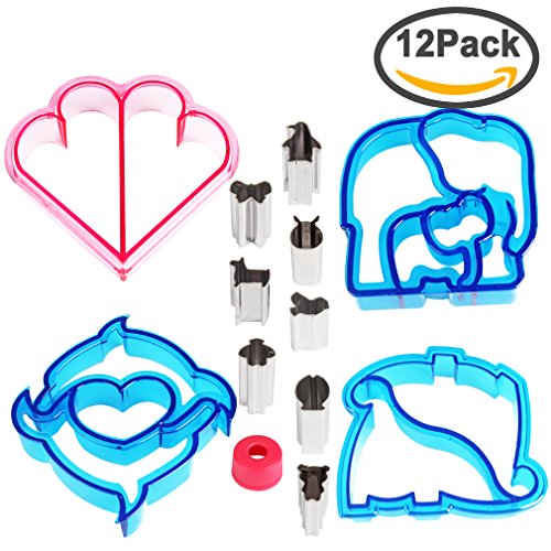 Big Value Pack Cookie Cutter Set: Package includes 12 pieces Vegetable Cookie Cutter Shapes mold in total, 4 pcs plastic sandwich bread cutter(elephant,dolphin,heart,dinosaur shape) and 8 pcs stainless steel Cookie Cutter Mold, with 12 different cute animal heart shapes, a great way to encourage your children or pets to be involved in food