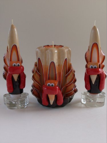Studio : Zee Candles Publisher : Zee Candles Binding : Kitchen Product Description A whimsical Thanksgiving decoration, this 5″ Turkey Pillar Candle is hand-dipped in layers of yellow, orange, red, rust and brown to create a rich earth-tone effect. Our adorable Turkey Candle makes the perfect addition to your Thanksgiving centerpiece or a great gift for whomever hosts Thanksgiving Dinner this year. Standing 6″ tall, the tapers are hand-dipped and feature hand carved "feathers" and a whimsical turkey face. Note: Flowers and stands are not included in the price. 0