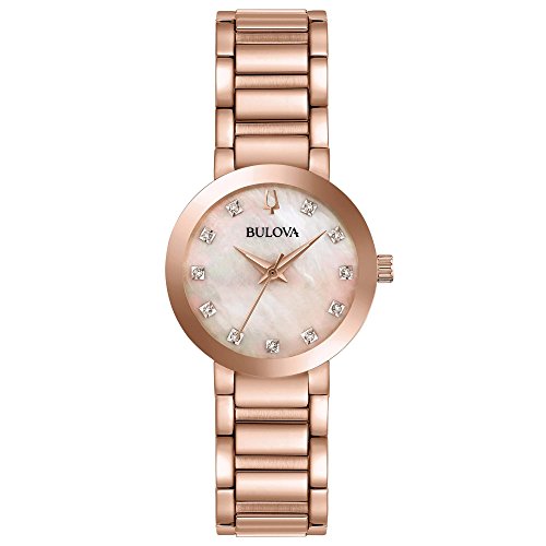 - The watch is made of rose gold-tone stainless steel and features 11 diamonds individually hand set on a rose-gold mother-of-pearl dial