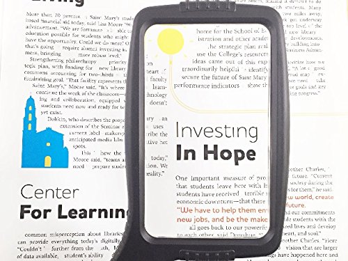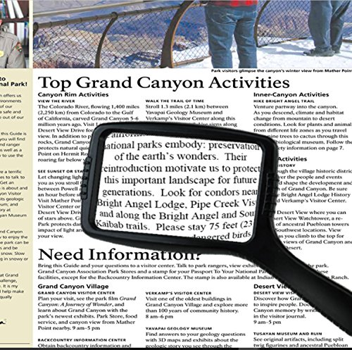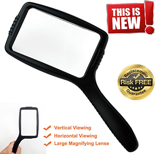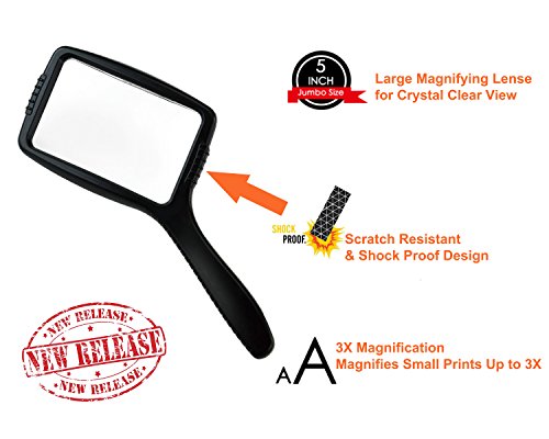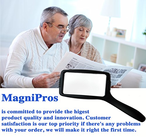 Studio : MagniPros Publisher : MagniPros Binding : Health and Beauty Product Description ? Professional Quality Magnifying Lenses Made of scratch resistant, shatterproof crystal clear lenses designed for people with low vision, seniors, hobbyists and professionals. ? Can be Held Vertically or Horizontally This jumbo magnifying glass is designed to be held vertically or horizontally can be adjusted to personal preference. ? Relieve Eye Strain Wide Horizontal Lens Wide Horizontal lens is proven to be the most comfortable magnifying lens for the eyes to view small prints. ? Shockproof Scratch Resistant Design Each magnifying glass is equipped with shockproof and scratch resistant design to protect the magnifying lens from shattered and scratched, because of the design the lens would never touch flat surface. ? Ultra Lightweight Ideal for Long Reading Time Most of the same size magnifying glass magnifiers are heavy, however, our 5" magnifying glass only weights about half, and it's comfortable to hold it for long time. ? Features of our JUMBO Size Magnifying glass ?Large SIZE 4.75" X 2.75 HIGH QUALITY magnifying lens ?Magnifies up to 3X lens focal length: 2.5" - 3.5" ?Optical grade magnifying lens for crystal clear image and distortion free viewing ? 4.5" HANDLE BAR is considered the most comfortable length for handheld purpose. ?Lightweight; it only weights half of the other 5" magnifying glass magnifiers ? ?Backed by a 100% No-Hassle, RISK FREE Money Back Guarantee Offered by MagniPros®!If you are not completely satisfied with our magnifying glass we will give you a full refund, no questions asked. 0
