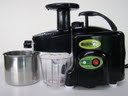 Multi-purpose functions allow greater versatility, from juice extraction to soy milk production to making perfect pasta (with optional Accessory Kit). Juices wheatgrass, barley grass, and herbs. Magnetized, bio-ceramic juicing jug keeps juice fresh with no loss of nutrition or oxidation for up to 72 hours. Easy to use, easy to clean. Cleans in just three minutes! Constructed mainly of recyclable materials. The quietest machine on the market (60 bB)! Collection jug prevents excessive build-up of froth. Makes nutritious ice cream, nut butters, jams, and baby food. Grinds coffee, grains, and nuts. Comes with: Three screens - normal-hole (for vegetables and wheat grass), large-hole (for pulpy fruit), and crush screen (for soaked grains and beans); Two Tampers (plastic and wooden); Magnetized 1-liter jug; Extra end cap, and One cleaning brush. The multi-purpose kit is Optional and not included with this offering For information purposes Functions of Mulit-Purpose Kit (Optional Feature): * Produces less pulp in juice. * Separates seeds when juicing grapes, without crushing the seeds * Produces less foam with wheat grass and barley grass juice. * Extrudes Pastas, Nut Butters, Baby Foods, Frozen Fruit Sorbet, Soy drink. * Grinding Hot Peppers, Coffee Beans, Sesame SeedsFeature