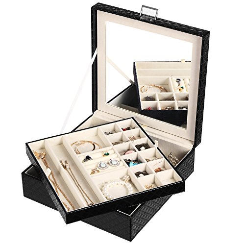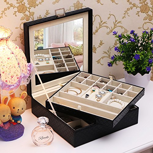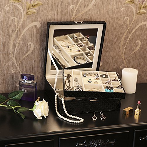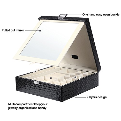-. Feature : OUTSTANDING CRAFTSMANSHIP & ELEGANT LOOK: Made from high quality bright embossed black PU leather cover, refined velvet interior, well-done seams, this well-built watch box is sturdy as well as elegant. / 2 LAYERS & 28 HANDY UNIQUE DIFFERENT COMPARTMENTS: This Jewelry box has 2 Layers and each layer has plenty of compartments of perfect sizes for different types of jewelry - earrings, rings, necklaces, bracelets, cuffs, etc. / LARGE REMOVABLE BUILT-IN MIRROR AND ATTENTIVE DESIGN: With a large stretchable makeup mirror, you can easily find the most suitable view for your everyday's makeup. Delicate antirust shining knob allow you open and close it in seconds by one handed operation, very convenient and no time consuming. Silk handles on the top layer makes it easy to carry around when needed / PERFECT SIZE & GORGEOUS ON DRESSER: Overall Dimension (D x W x H): 10.25" x 10.25" x 3.55". Well-constructed, elegant, compact and spacious at the same time, this gorgeous will keep all your favorite jewelry in one place and easy to find. / EXTENSIVE USE & GREAT GIFT IDEA: Not only for everyday use or shop display, this jewelry box can also be a perfect travel companion. Your beloved would not be happier when receiving such a nice gift on Valentine's Day, Christmas, New Year, Birthday, Wedding and so on.