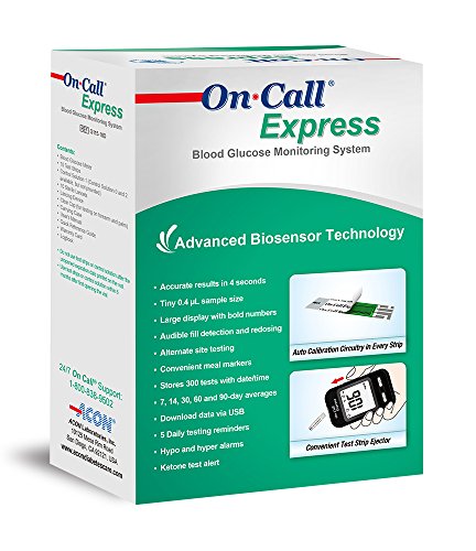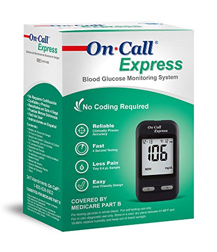 Studio : On Call Express Publisher : On Call Express Binding : Health and Beauty Product Description Change the way you test with the accurate and affordable On Call Express Blood Glucose Monitoring System. With advanced biosensor technology, this new meter requires no coding, gives fast results in only 4 seconds from a tiny 0.4 microliter sample size and includes audible fill detection for easier testing. Manufactured for your needs, the meter includes a large display screen with bold numbers that are easy to read. Results are even easier to track with 7, 14, 30, 60 and 90-day averages, customizable alarms, and meal makers. Starter Kit includes the On Call Express Blood Glucose Meter with one pre-installed CR2032 battery, 10 On Call Express Test Strips, premium On Call Lancing Device with clear alternate site testing cap, 10 On Call Sterile Lancets (30G), 2mL of On Call Express Control Solution 1, carrying case, log book, user's manual (English and Spanish) and quick start guide (English and Spanish). 0
