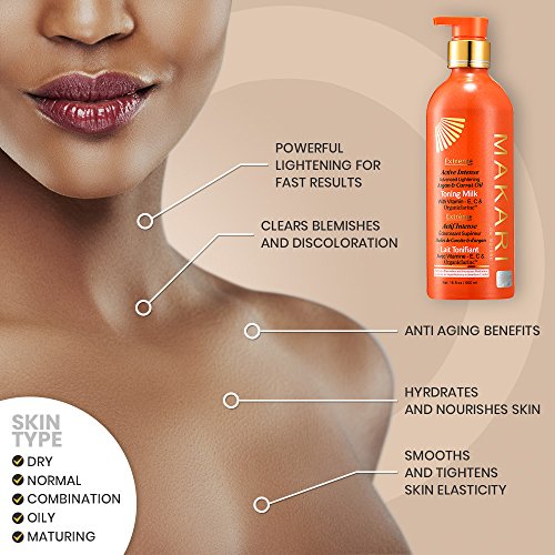 Take luxurious skin care to the extreme. For years, women of color have sought high-end skincare products designed exclusively for their unique concerns. Finally, with the Extreme collection by Makari, everyone can achieve the clear, smooth, glowing complexion they've always dreamed of. Specially formulated for all skin types, our rejuvenating Extreme Carrot & Argan Oil Toning Milk is enriched with OrganiclarineTM, a naturally derived active whitening agent. Regularly apply lotion all over skin, and watch as dark spots, acne blemishes, scars, and hyperpigmentation fade away for a fresh, youthful, perfectly even appearance. Infused with antioxidant-rich vitamins C and E, it also smooths uneven texture and tightens saggy skin for maximum anti-aging effects. Use routinely with Makari's complete line of Extreme lightening products to achieve your ideal shade of beautiful!