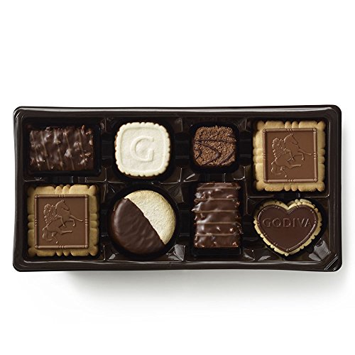 Includes Dark Truffle Heart, Hazelnut Belgique, Chocolate Lune, Petite Mousse, Raspberry Chocolate Premiere, Godiva Signature, and Hazelnut Praline chocolate biscuits