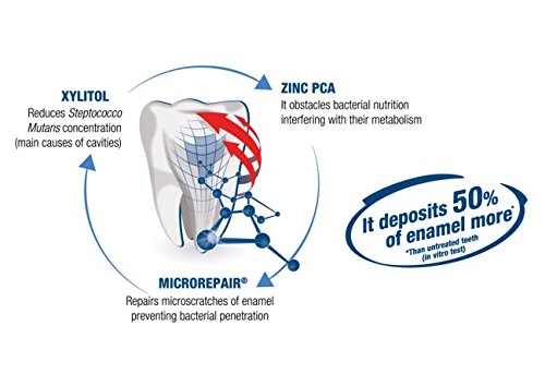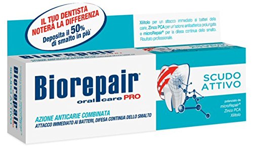 Biorepair® is the toothpaste that actually repairs tooth enamel! Although on the surface most teeth look healthy, daily wear and tear causes hundreds of tiny flaws to appear in tooth enamel. Over time, plaque and bacteria can form in these flaws and can lead to more serious damage such as tooth decay and sensitivity. Biorepair® works to repair tooth enamel, prevent decay and reduce sensitivity by filling in the tiny cracks and binding to the structure of the enamel. Biorepair® PRO Active Shield ensures an conbined anticavity action. It prevents creation and development of bactedia thanks to combined action of Zinc PCA and Xylitol. The microRepair® defends enamel repairing microscratches of enamel preventing bacterial penetration. The innovative formula of Biorepair® PRO Active Shield prevents formation and developments of bacteria thanks to combined action of Zinc PCA, active ingredient that acts on bacteria presents into oral cavity interfering with their metabolism, and Xylitol that reduces Steptococco Mutans concentration, main causes of cavities. Moreover, microRepair® repairs microscratches of enamel preventing bacterial penetration. EFFECTS: