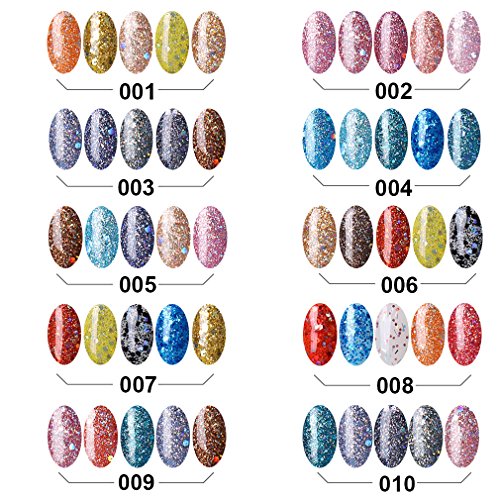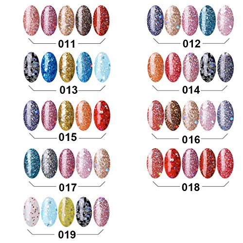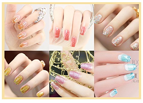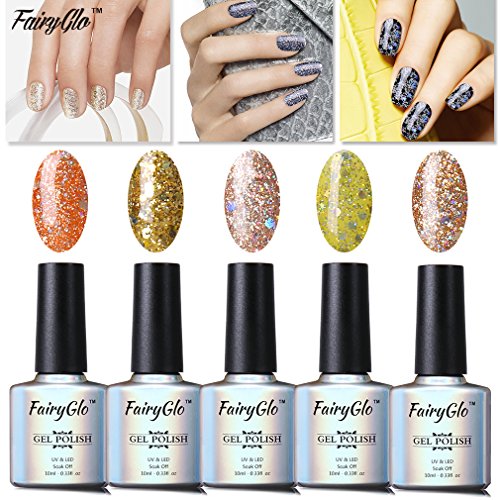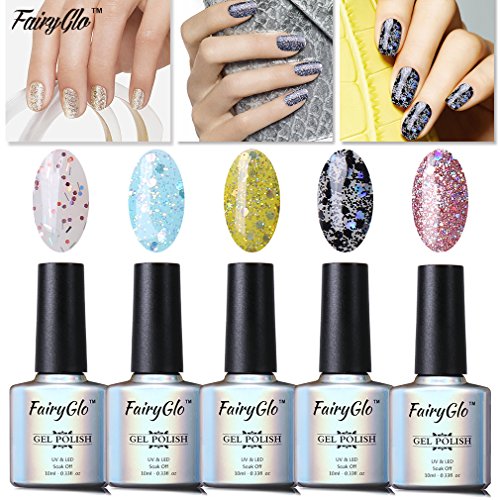 -. Feature : Item Included: 5 x 10ml Glitter Gel / FairyGlo: NON-TOXIC and Harmless Resin, High quality gel with low smell, good tenacity. On like polish, wears like Gel, off in minutes.Color resistant, flexible and shiny resistant to any test.Suitable to Natural nails, UV gel nails, false nails, acrylic nails, nail tips, etc. / Well-Selected : Super Bling to show your Gorgeous and Elegancy. Exclusive Nail Polish Set for our customers to experience professional Soak-off Nail Art and to show your personality and mood. / Required : Drying under UV LED Lamp. / Long Lasting , High Gloss Beauty: Lasting for at least 2-3 weeks.End of redoing from scratch.No more imperfect surface, dents or nails cutNo grinding. No filing. No drying time after application: curing with UV gel.Mirror Finish.