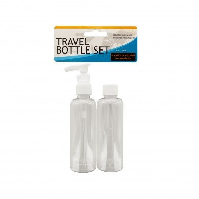 -. Feature : Ideal for shampoos, conditioners, hairspray and lotions, this 3-piece Travel Twist Top & Spray Bottle Set features durable plastic containers that hold the perfect amount for trips to make travel easier. Set includes two twist top bottles and one spray bottle with a cap. Comes packaged in a poly bag with a header card. / deal for shampoos, conditioners and lotions, this 2-piece Travel Twist Top & Lotion Pump Bottle Set features durable plastic containers that hold the perfect amount for trips to make travel easier. Set includes one twist top bottle and one lotion pump bottle. Comes packaged in a poly bag with a header card.
