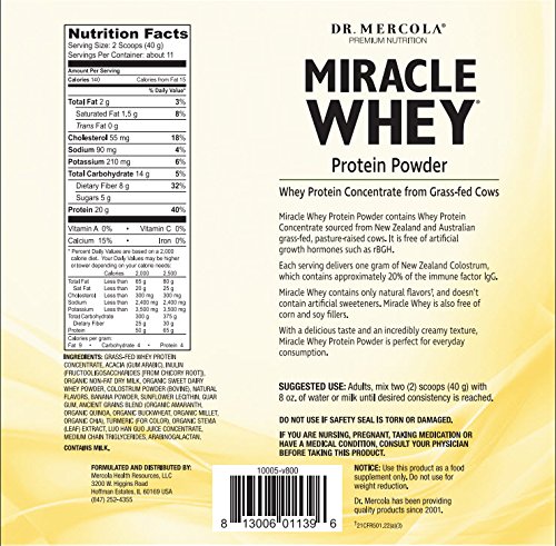 -. Feature : Miracle Whey protein powder contains all the essential amino acids, supports immune and muscle health, promotes endurance, protects tissues' cells, and supports a healthy metabolic rate. / Dr Mercola Miracle Whey is made from all-natural pasture-fed cows' whey. GMO and pesticide free, this superior protein powder doesn't contain heavy metals including mercury, lead, cadmium or arsenic. / Miracle Whey protein powder contains beta-glucans that modulate your response, so you can be sure that your immune system is getting the boost it needs. / Miracle Whey will give you a boost in energy, promotes satiety so you won't feel hungry, supports health blood sugar levels, and is rich in amino acids to aid in muscle-building. / With eight delicious flavors available, you're sure to find a tasty AND healthy way to supplement your diet - Look for maple, vanilla, strawberry, chocolate, blueberry, banana, original, and peanut butter flavors!