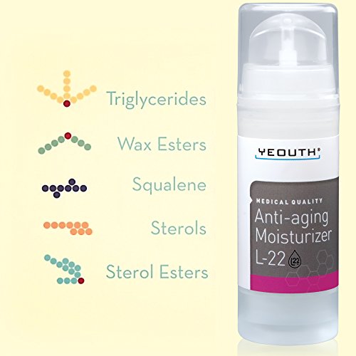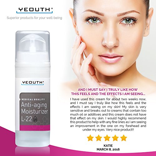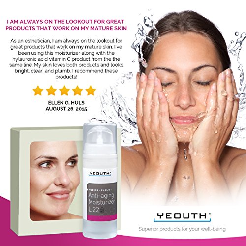 -. Feature : YEOUTH Anti-aging Moisturizer bests other cream, lotion, serum and toner products, making a visible difference in the look of crow's feet, wrinkles and fine lines, improving skin tone / Acts like an anti-wrinkle eraser, reducing and diminishing discoloration, sunspots and age spots / Contains potent organics that go to work day and night defying age on your face, hands, neck, elbows; anywhere on the body a woman or man desires smoother skin / L22 lipid complex is derived exclusively from natural botanical nutrients including jojoba oil, macadamia oil and olive oil / L-22 demonstrated superiority to other skin-lipid-like compounds when evaluated for barrier repair and skin hydration in clinical studies. L22 demonstrated significant improvements in both aged and sun-damaged skin with regard to skin hydration, firmness, and elasticity in clinical studies