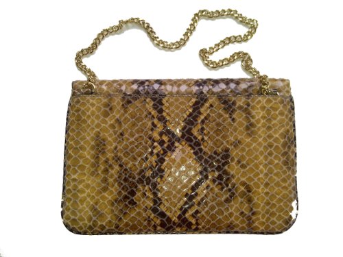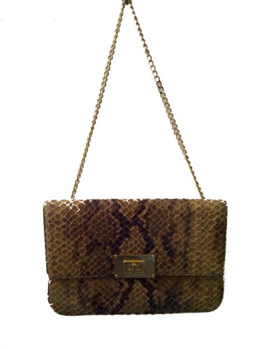 Wrapped in multi-tone brown tone python embossed glazed leather with gold tone hardware. The MK color code is 'sand'. It secures with a turn-lock closure engraved with Michael Kors logo. The lined interior features a zippered pocket, an open slip pocket and 6 card slots. There's an open slip pocket on the back. It has a gold tone chain strap with a generous 11.5" drop. So you can wear it on your shoulder, carry by the strap, or tuck the strap inside to use it as a clutch. It measures approximately 10.5" (L) x 7" (H) x 1" (W).Feature